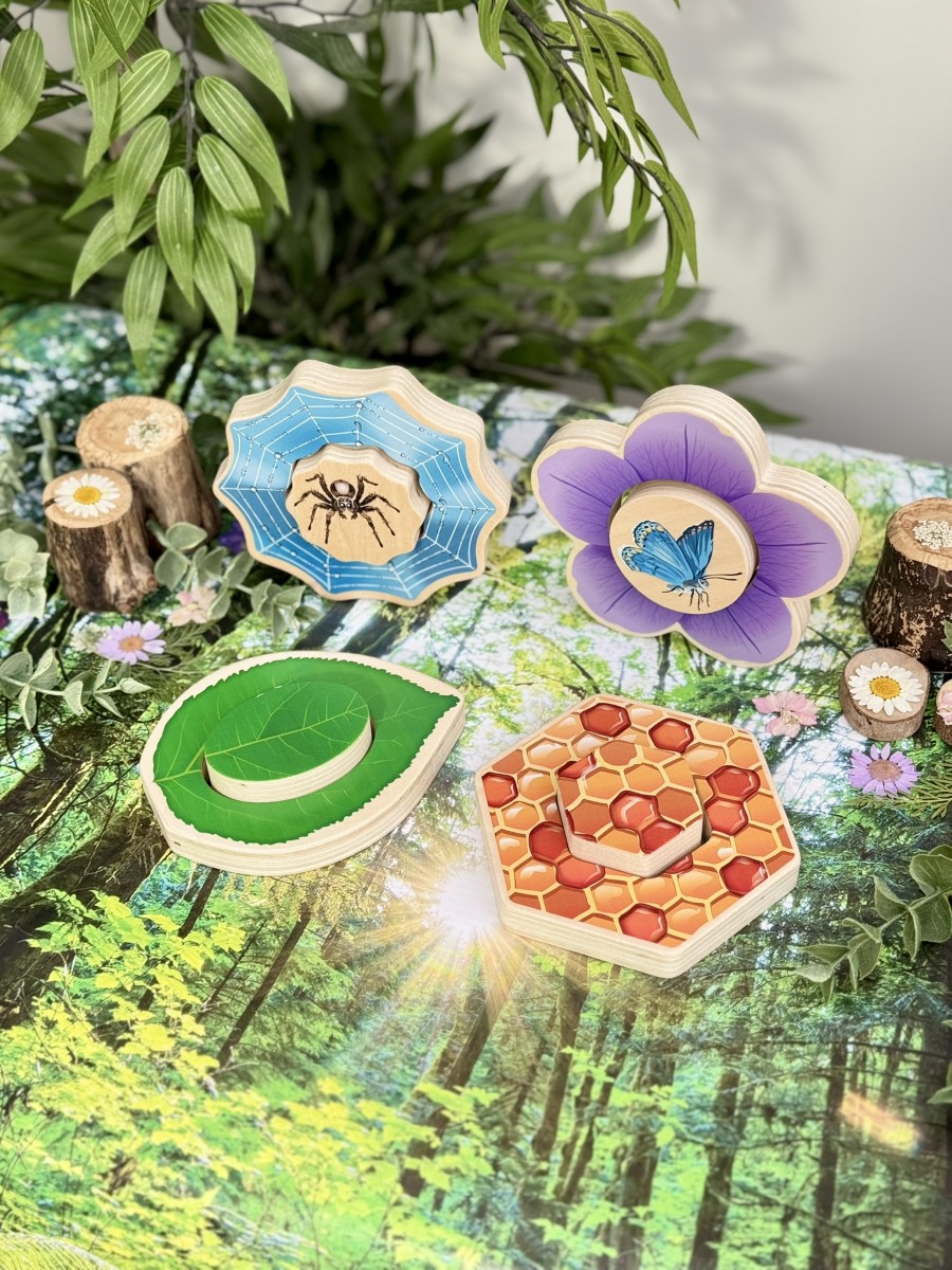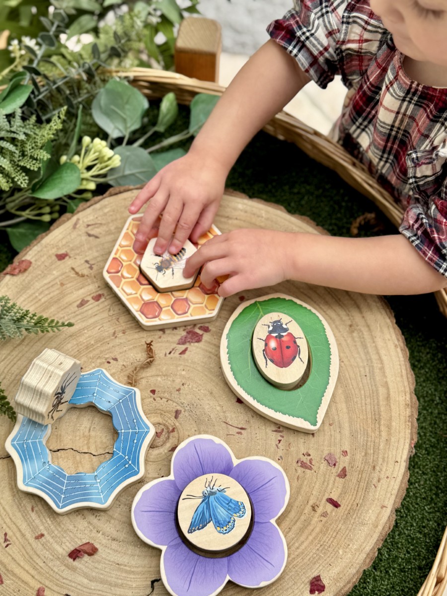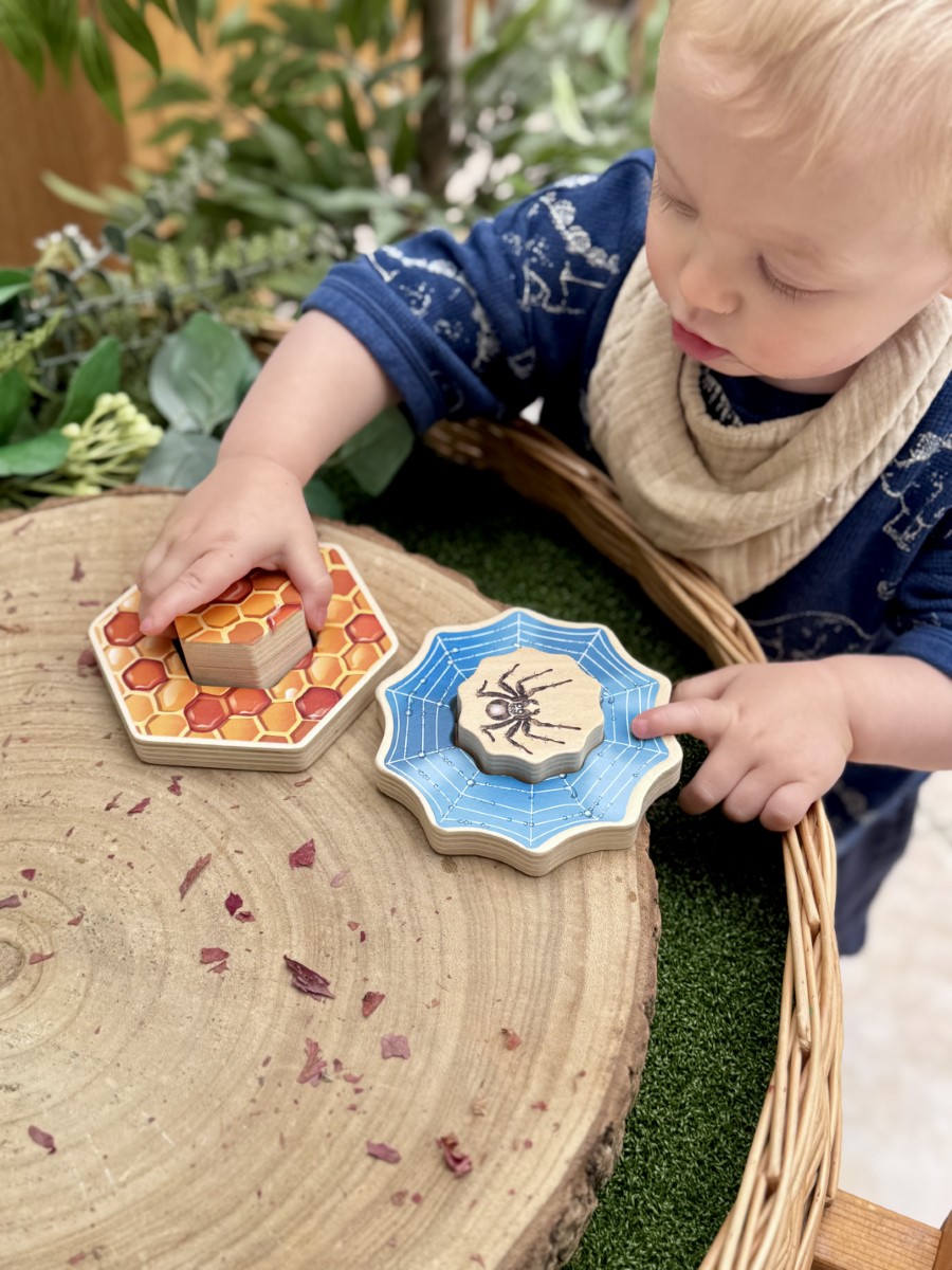 • Set four, 2-piece puzzles: Butterfly and flower, Ladybug and leaf, Honeybee and honeycomb, Spider and web